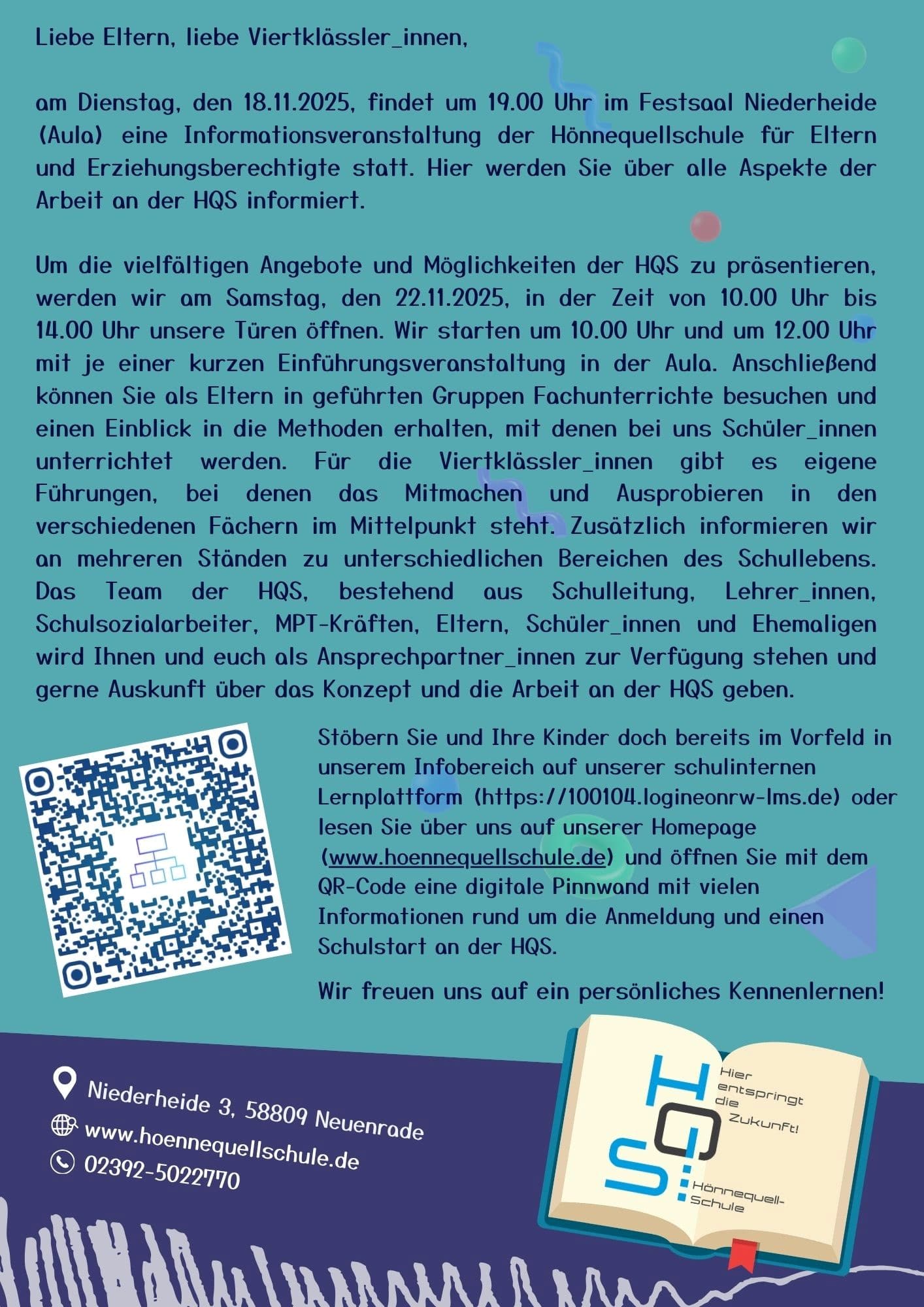 • Die HQS ist eine Schule für alle Schüler_innen, unabhängig von den jeweiligen Begabungen und Empfehlungen. Daher nehmen wir Kinder aller Leistungsstärken, von unterschiedlicher sozialer Herkunft, mit und ohne Förderbedarf auf.
