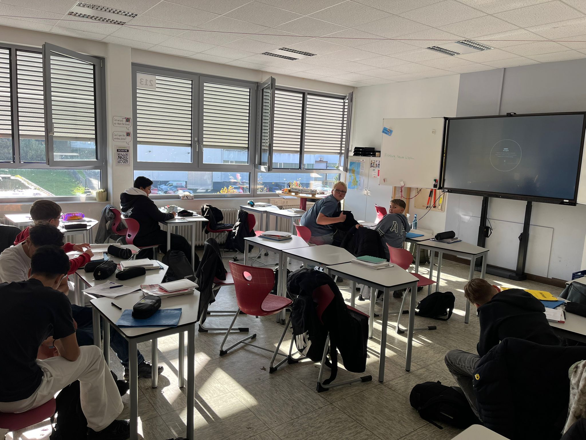 In den Klassenräumen wurden die üblichen Tafeln mit interaktiven Touchscreens getauscht. Neben Tafelbildern können auch fachspezifische Apps genutzt werden, wobei bis zu vier Schüler_innen gleichzeitig arbeiten können. Eine Präsentation von vorbereiteten interaktiven Arbeitsblättern, Lernvideos etc. ist ebenso möglich, wie die Demonstration von Schülerergebnissen. Da neben einer Android-Oberfläche auch ein PC integriert ist, ist die Vielseitigkeit des Einsatzes nur abhängig von der Kreativität der Lehrer_innen und Schüler_innen.