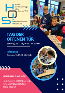Wir laden alle Eltern und Erziehungsberechtigte herzlich ein zu unserem Infoabend am Dienstag, den 18.11.2025 um 19.00 Uhr in die Aula der Hönnequellschule (Niederheide 3, 58809 Neuenrade). Hier werden Sie über alle Aspekte der Arbeit an der HQS informiert.